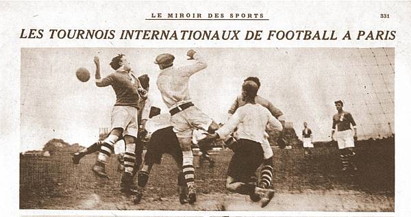 1. Sur les buts parisiens, Errasquin (maillot blanc) et Diaz ont sauté vers la balle que l’Espagnol a touchée de la tête. On reconnaît Lund, Domergue, Clément et Stuttler.