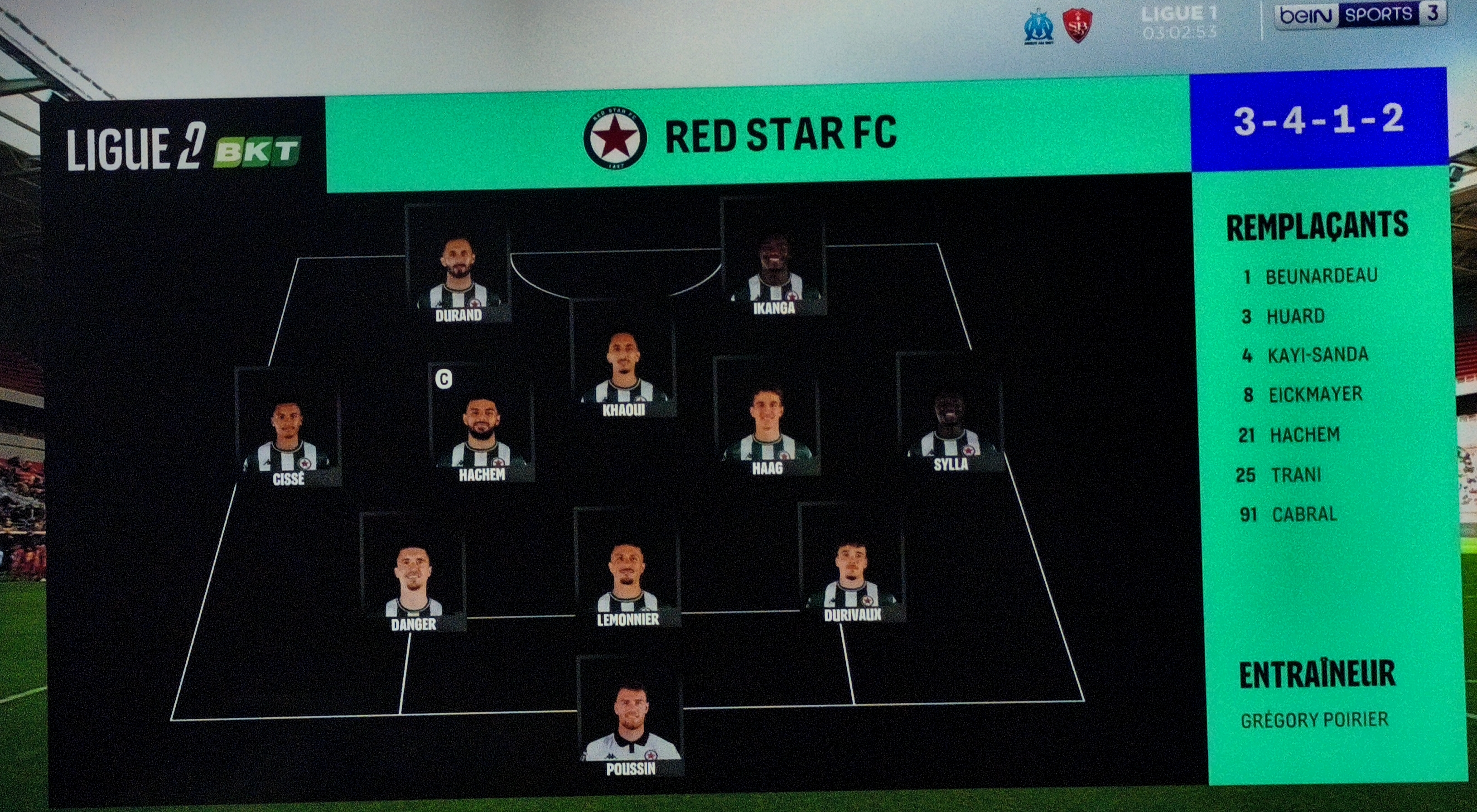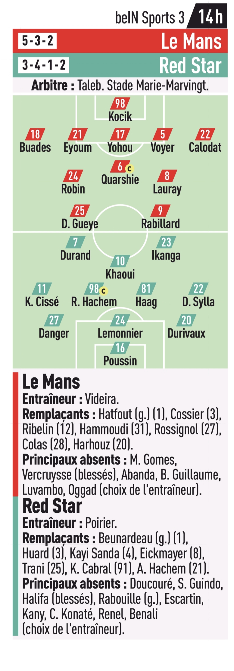 Red Star : Poussin - Durivaux, Lemonnier, Danger (Huard, 78e) - Haag - Sylla, Khaoui (Eickmayer, 79e), R. Hachem (cap.), Cissé - Ikanga (Benali, 87e), Durand (Cabral, 78e). Entr. : Poirier.