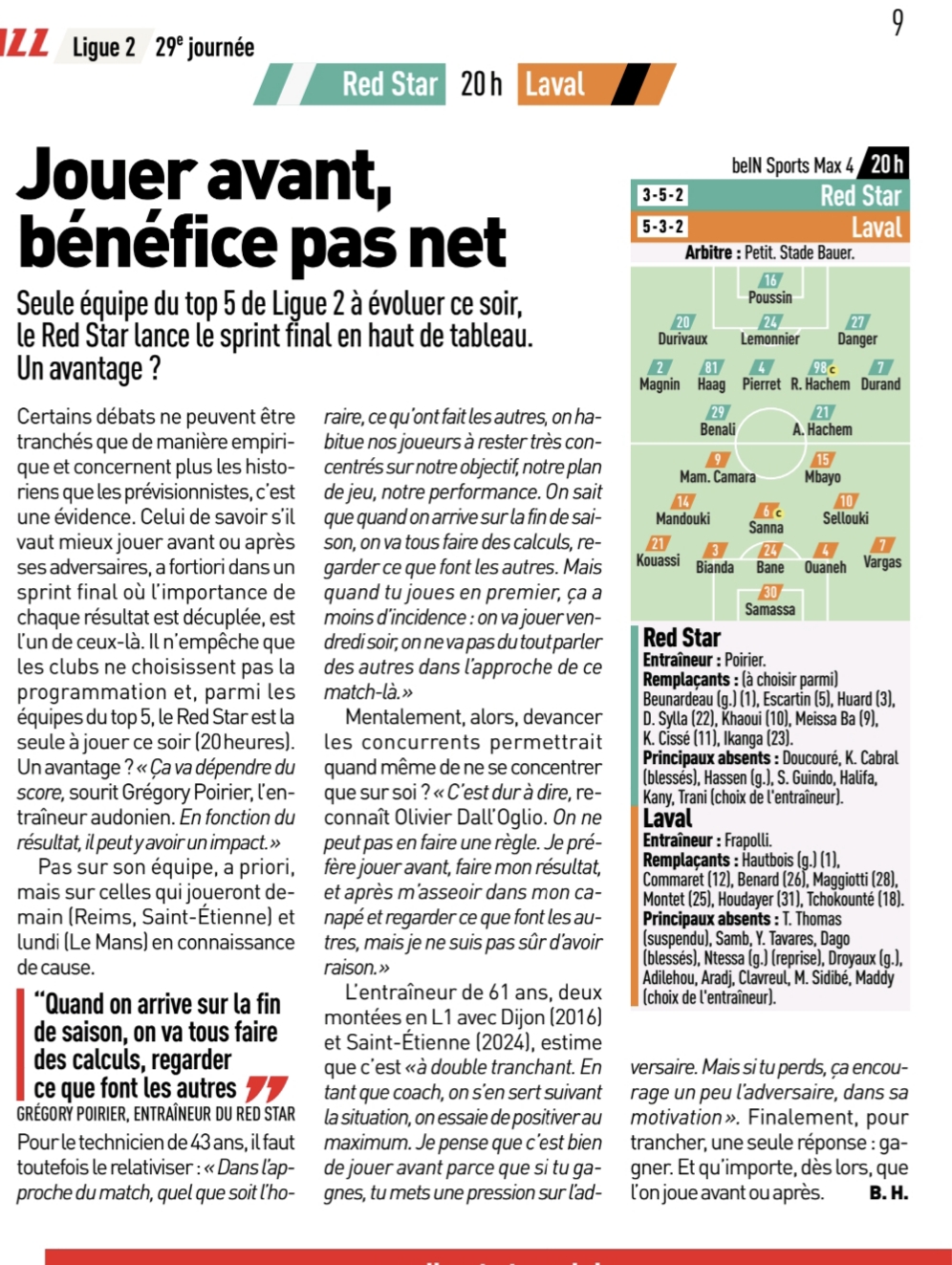 Après trois matchs sans victoire à l’extérieur, le Red Star s’est imposé ce vendredi soir à Clermont pour le compte de la 28e journée de Ligue 2. À six journées de la fin, le club de Saint-Ouen occupe toujours la 4e place du classement. Son coach Grégory Poirier a par ailleurs été exclu.
