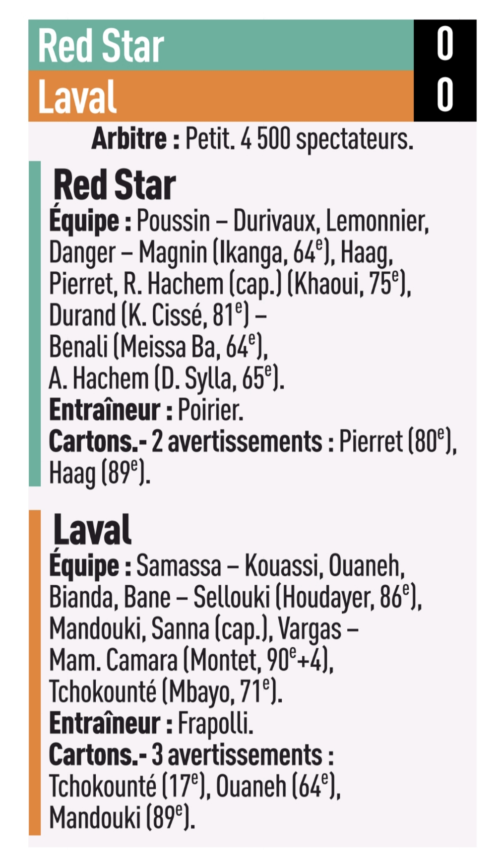 Red Star : Poussin - Durivaux, Lemonnier, Danger - Haag - Magnin (Sylla, 74e), Pierret, R. Hachem (cap.), Durand (Cissé, 74e) - Cabral (Ikanga, 62e), A. Hachem (Benali, 62e). Entr. : Poirier.