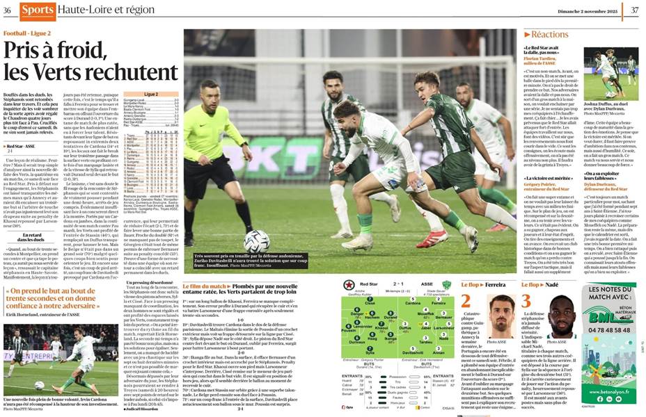 Au retour des vestiaires, Saint-Étienne se montre plus pressant devant le but de Poussin. Le portier audonien repousse les frappes de Cardona -69e) puis Stassin (70e) avant de s’incliner sur un coup franc de Davitachvilli (2-1, 71e). Le Red Star plie mais ne rompt pas. Au coup de sifflet final, Damien Durand et ses partenaires vont remercier leur public de leur soutien indéfectible. Celui-ci pourrait vivre encore de belles soirées cette saison…