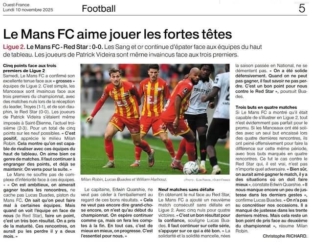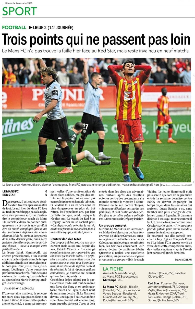A la fin chaque équipe était heureuse du résultat, Le Mans pour une neuvième journée sans défaite, un très bon parcours pour un promu qui a conservé l’ossature du groupe qui évoluait la saison dernière en National et avec ce point ramené de la Sarthe, le Red Star n’est plus qu’à un point du leader Troyes, battu de justesse par Saint-Etienne qui récupère sa place sur le podium à un point des Audoniens.