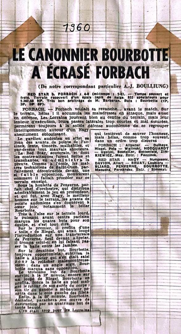 FACE A FORBACH, EN D 2 En 1960, le 17 janvier, le Red Star assomme Forbach 4-0 avec quatre buts de Gérard Bourbotte, sa seule saison au Red Star. Champion de France 1954 avec Lille et vainqueur de la Coupe de France, en 1953 et 1955, avec deux réalisations en finale, lors de la seconde finale