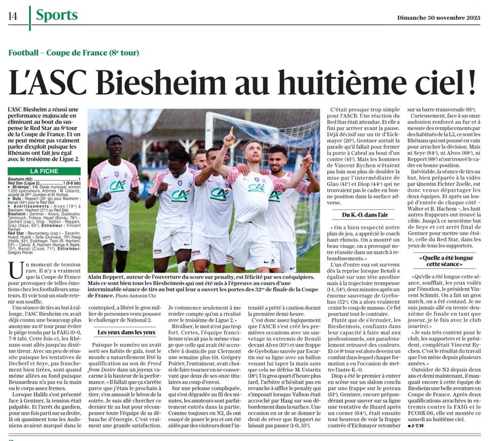 BIESHEIM – RED STAR, DANS LA PRESSE Le club absacien jouera un club de L 1, lors des 32èmes de finale, Metz, souhaitons que Biesheim poursuive leur aventure en Coupe de France 2026.