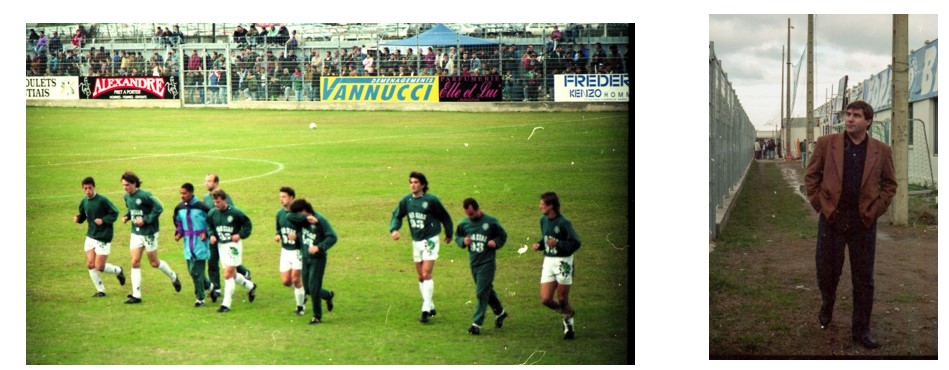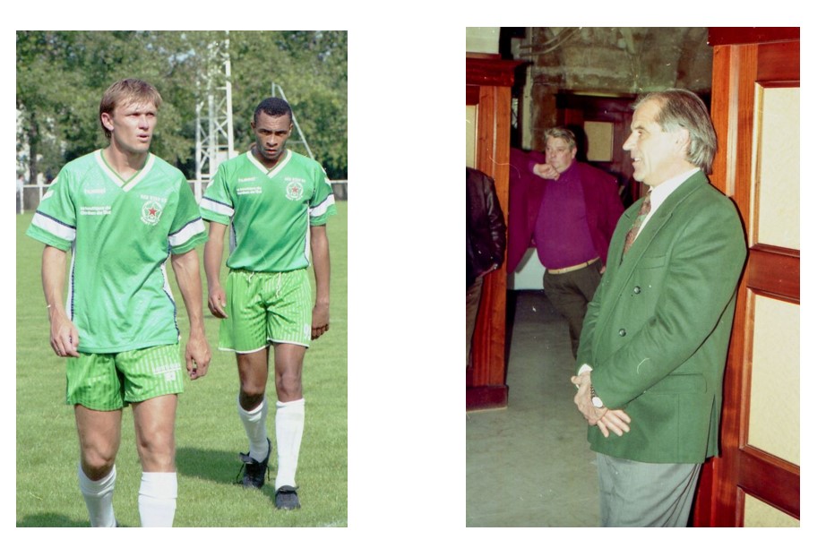 A gauche : Sergueï Rodionov et Didier Thimothée. A droite, en 1994, lors du millième match du Red Star, en D 2, Christian Laudu, au fond Richard Detemmerman, ancien dirigeant du Red Star © Gérard Valck