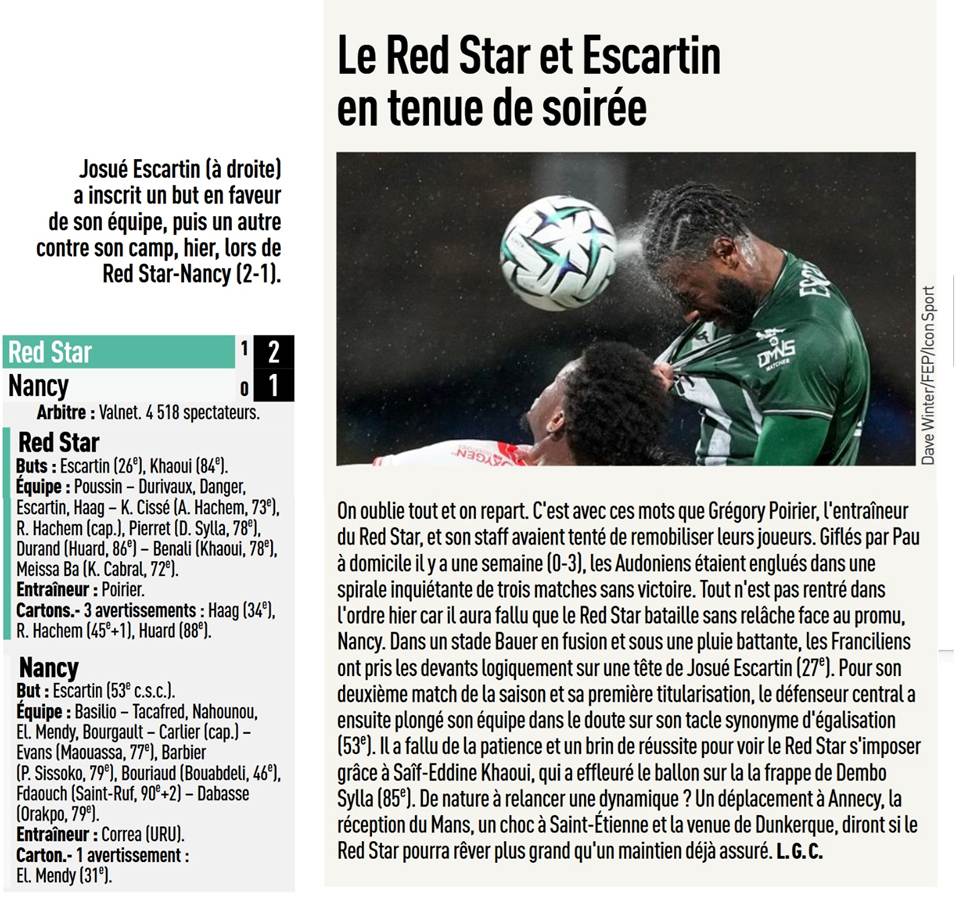 Buts. Red Star : Escartin (26e), Khaoui (85e) ; Nancy : Escartin (53e c.s.c.).