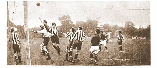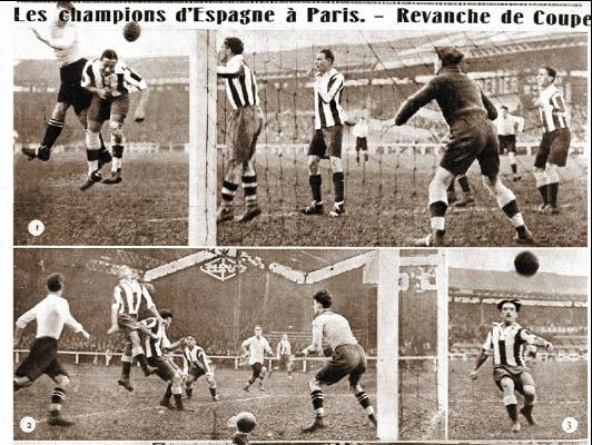 1. Sur les buts parisiens, Errasquin (maillot blanc) et Diaz ont sauté vers la balle que l’Espagnol a touchée de la tête. On reconnaît Lund, Domergue, Clément et Stuttler.