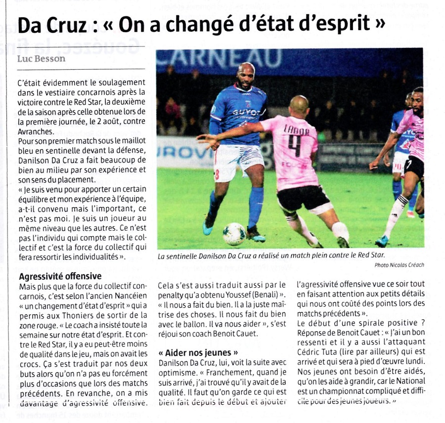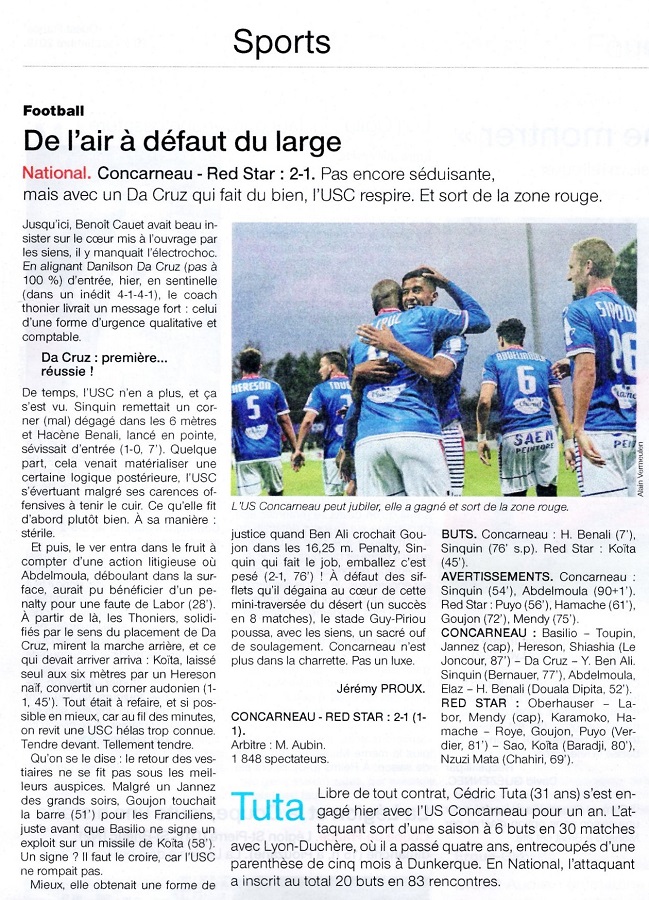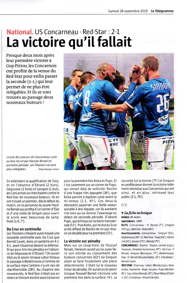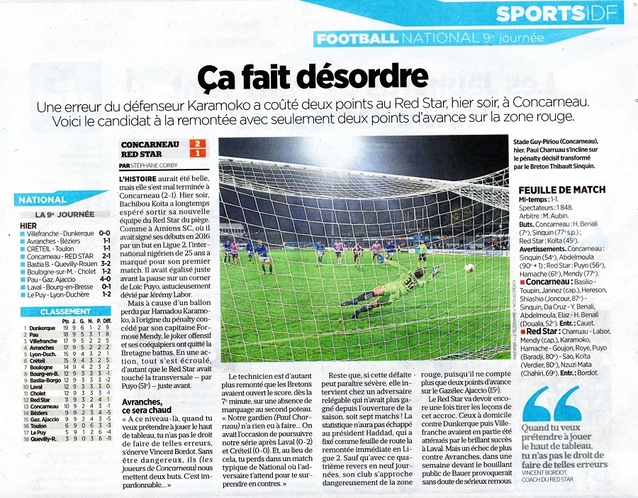 PAN SUR LE BEC Dans nos dernières infos, nous avions annoncé que sur les deux matchs à Concarneau, les Bretons avaient remporté la dernière confrontation. Ce n’était pas le cas, le Red Star avait remporté les deux matchs avant de perdre vendredi dernier !
