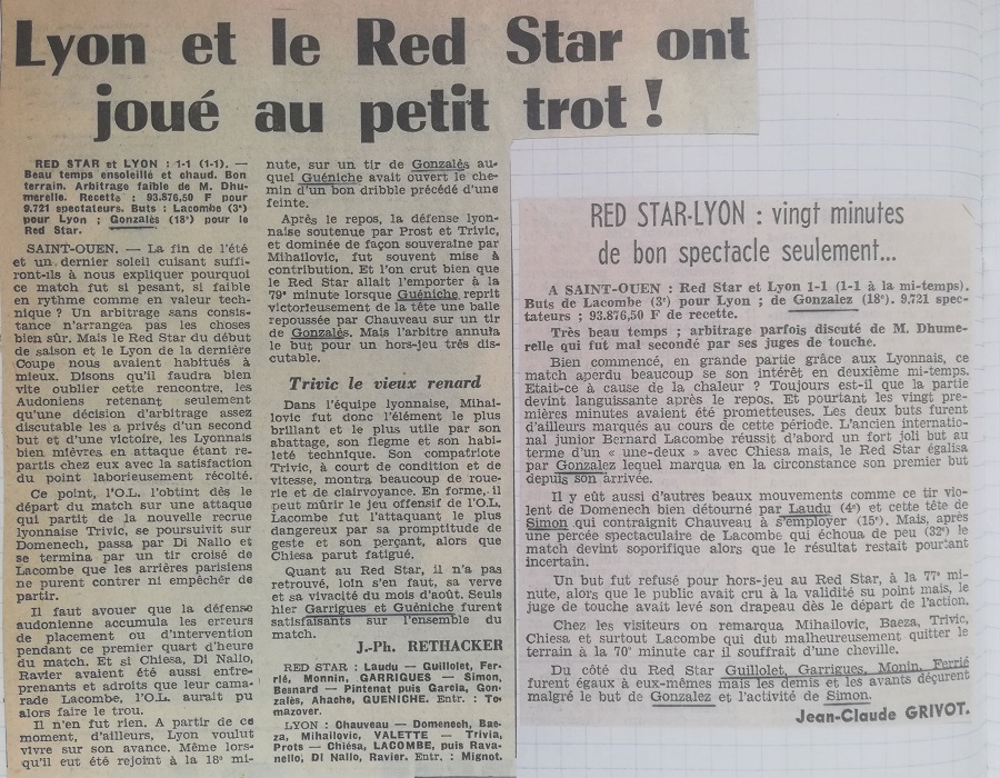 UN MATCH DU PASSE Entre le Red Star et Lyon, en D 1, en septembre 1971